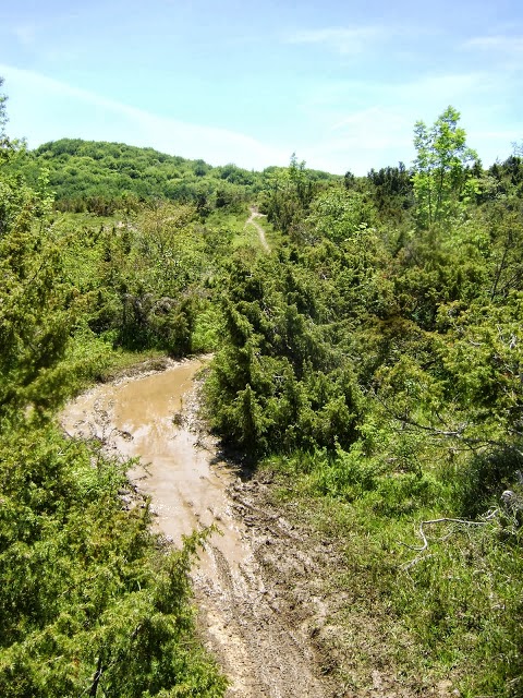 Cojo la fuente,meto la bici,meto los pies con zapas y todo y una vez fresquito a comer tortilla de patatas...ya era la Una!!!kms??no se...unos 50 o asi...y ahora que hago???al parecer he cobrado fuerzas y la gente parece que sigue(deben de estar acostumbrados al barro por aqui)asi que retomamos la marcha con energias renovadas hacia el tercer avituallamiento,hay asistencia mecanica y aprovecho para que unten de aceite mi cadena que estaba bien seca...sigue habiendo barro...pero ya de mejor calidad,pasa la rueda y apenas se pega a la bici,al cuerpo ya no se pega porque ya no hay sitio donde agarrarse,soy el zfg negro!!jeje...Toda esta parte recorre los bosques de Izkiz,de nuevo la espectacularidad del entorno hacen las subidas llevaderas:bosques cerrados,cascadas,riachuelos, vias verdes...y yo me encuentro ahi en medio,gozando como un enano y replanteandome continuar y por lo menos llegar al 4 avituallamiento antes de las 19:00,porque si me paso me descalifican y me desvian por carretera a Campezo.Asi pues,todo transcurre tranquilamente,hay muchos pueblos y fuentes donde refrescarse y llevo un monton de comida encima asi que cojo un ritmo suave(creo me salio la media de 8-9Km/h).